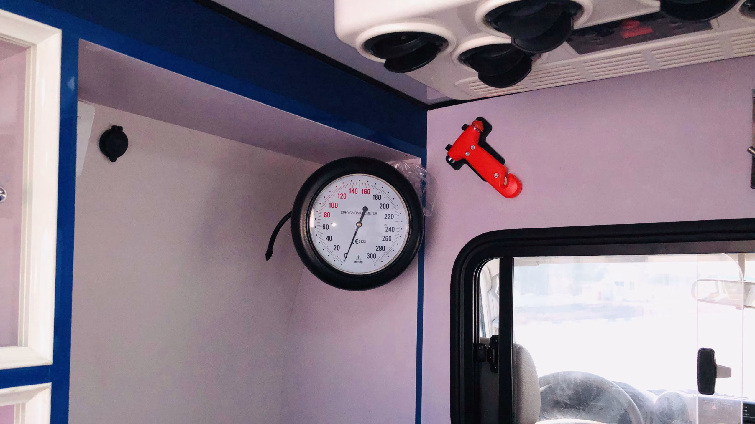 This setup ensures that the mobile clinic is fully equipped for on-the-go medical care, with all essential equipment powered and easily accessible.